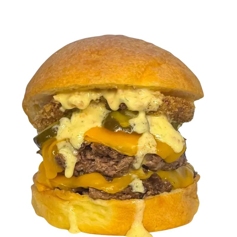 Pan brioche casero, dos piezas de 130g carne de vaca rubia dry aged, queso americano, pepinillo, aros de cebolla rebozados y salsa baconaisse.
