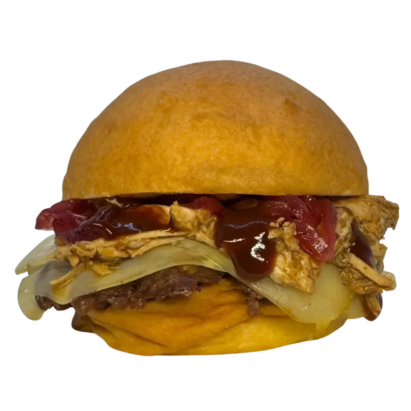 100g de vaca rubia dry aged / queso ahumado /carne de cerdo a baja temperatura deshilachada / cebolla agridulce / salsa barbacoa.
