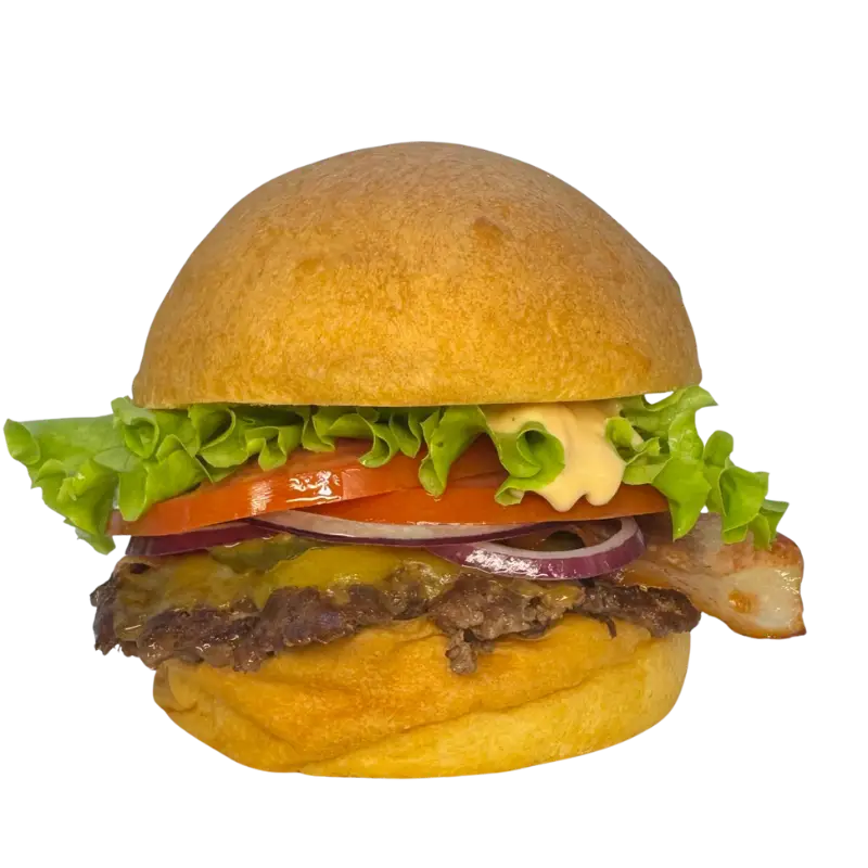 Pan brioche casero, 130g de vaca rubia dry aged smash, queso, bacon, cheddar, pepinillos, cebolla, tomate, lechuga y salsa burger.